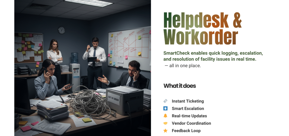 SmartCheck transforms the helpdesk experience with end-to-end digitization. Through multi-channel request capture, SLA-based automation, and real-time performance dashboards, SmartCheck ensures every service request is tracked, routed, and resolved efficiently. Facility Heads and Operations Teams gain full control and visibility over internal and vendor performance.