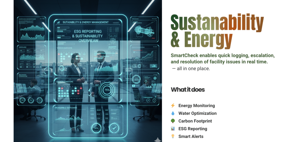 SmartCheck enables enterprises to monitor and optimize resource consumption across electricity, water, gas, and carbon streams. Through automated ESG reporting, carbon dashboards, and intelligent alerts, SmartCheck simplifies compliance while driving measurable sustainability outcomes. Executives gain the confidence to demonstrate progress to boards, regulators, and stakeholders with data-backed insights.